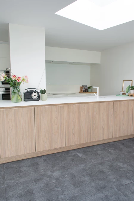 Parquetvinyl keittiössäsi? Miksi ei? Tämä lattia on helppohoitoinen, ja lisäksi se kestää kolahdukset ja iskut, joten se on unelmavalinta asumiseen. Caldera Basalt tarjoaa laatan kestävän ulkoasun, mutta myös vinyylin lämmön. Myös paljain jaloin kävely tällä lattialla on erittäin miellyttävää.